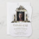 celebration of life invitation with photo bordered with golden candles and photo in between with chic script typography against Cream White background in front and dark gold in back.