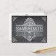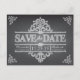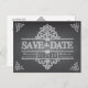 Intricate swirls, scrolls and text, drawn with a chalk effect, and placed on a black chalkboard background, all combines to make a beautiful and casually elegant Save the Date wedding postcard.