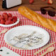 Stylish Happy New Year party paper plates feature a watercolor champagne bottle with gold and white balloons and your details in chic lettering.