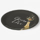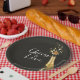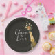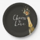 Chic wedding paper plates featuring a sleek black background with champagne gold accents and a celebratory champagne bottle illustration. Perfect for modern, upscale, or classic weddings, these plates add a sophisticated and stylish touch to your wedding table decor. Ideal for couples seeking a timeless and elegant detail for their special day.