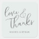This elegant wedding sticker features a minimalist design with flowing cursive typography that reads "love & Thanks" in a sophisticated dark hue against a light grey background. The layout is clean and uncluttered, emphasising the heartfelt message with ample negative space around the text. Below, customisable names can be added in a simple sans-serif font, making it perfect for personalising your special day. The overall style is romantic and intimate, ideal for expressing gratitude and affection at weddings or other celebrations.