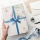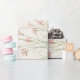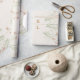 The wrapping paper features delicate soft creamy watercolor wild flowers and greenery foliage with initials.