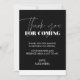 🌟 Celebrating a birthday is about more than just the cake; it’s the moments that linger after the last slice. Our Elegant Black Chic thank you card captures that sentiment perfectly, offering a sleek black background that feels both elegant and modern. The front showcases three‑quarters of deep black fading into a crisp white base, while a bold white headline reads “thank you for coming.” Below, a heartfelt message and “love + name” appear in the same clean white type, creating a harmonious flow that resonates with every recipient. 🎉✨💌