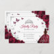 Burgundy silver and white Quinceanera RSVP reply card. Features brunette girl in ball gown dress, script font, silver butterflies, dark red roses and tiara. Perfect for an elegant princess style glam celebration. Personalize with your own details.