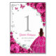 Fuchsia pink silver and white Quinceanera celebration table number cards. Features brunette girl in ball gown dress, script font, silver butterflies, hot pink roses and tiara. Perfect for an elegant princess style glam celebration. Personalize with your own details.