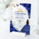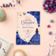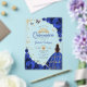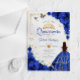 Royal blue gold Quinceanera celebration acrylic invitation. Features brunette girl in ball gown dress, script font, gold butterflies, roses and tiara. Perfect for an elegant princess style glam celebration. Personalize with your own details. Stylish transparent or frosted acrylic invitations.