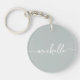 Elegant Sophisticated Sage Green Girly Monogram Name Script Custom Personalised Keychain. These Simple Minimalist design featuring your first name in a pretty hand lettered style swash tail font signature typography (or calligraphy) script on sage green or dusty green colour background. So easy to customise. Great stylish feminine housewarming gift, also for birthday, wedding, mother’s day, bridal shower, baby shower, sweet 16 birthday party, for graduation party and It’s for the girl who loves unique stylish things.