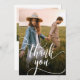 Modern Boho Chic Calligraphy Script 2 Photo Wedding Thank You Card. Stylish wedding thank you template featuring a full vertical photo on the front with the text "Thank You" in a whimsical swirly hand lettering typography swash tail font script white overlay on the picture. At the back side pre-made thank you message with one photo. Easily to personalise your name and thank you message. If you prefer to handwrite your note, just delete the sample text to make more space. If You need help or matching item, please contact to me!