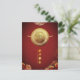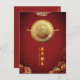 Golden Ox into a golden circle with Ox ideogram and "Year of the Ox" + "Happy Chinese New Year" in English and Chinese (calligraphy) on a delicate dark red background with peonies and Chinese fan. Design on vertical holiday postcard. Matching greeting card and more... Perfect for Chinese New Year of the Ox 2021.
