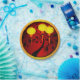 Celebrate the Chinese New Year with a this elegant design featuring a red patterned background and a gold circle with gold lanterns, a tree silhouette with a monkey, and the lettering for monkey.