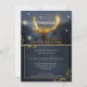 An elegant Christmas Open House invitation featuring a deer with stylized glowing antlers and festive light sparkles. The colors are dark navy blue with gold.