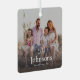A stylish, modern photo holiday ornament featuring your surname in classic typography paired with a handwritten script font in white, elegantly overlaying your full-size photo. Your chosen image will shine in this unique, minimal design—perfect for making a statement this Christmas season!