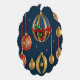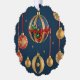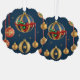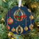 Golden and red Christmas baubles and ornaments are elegantly hung with ribbons, creating a festive and refined holiday decoration display against a dark blue background with subtle snowflakes.