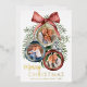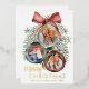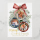 Add your own photos to this unique holiday card, featuring Christmas ornaments with photos inside hanging from pine sprigs with a bow on top. Real gold foil for the text and the frames around the photo add to the elegance. For additional matching products or design questions, please contact me through Zazzle Chat.