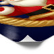 Golden and red Christmas baubles and ornaments are elegantly hung with ribbons, creating a festive and refined holiday decoration display against a dark blue background with subtle snowflakes.