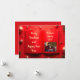 Elegant Christmas photo card design featuring a vibrant red background with golden ornaments, festive pine branches, and a centred photo frame on an open-book style layout. Customisable with your family name and year, this holiday greeting card is perfect for sending warm Merry Christmas wishes to friends and loved ones. A beautiful blend of modern minimalism and timeless Christmas charm.