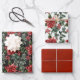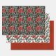 This elegant wrapping paper will be stunning under your tree! One is poinsettias, berries and snow frosted greenery against a black background, another has the same pattern only against a white background and the third paper is a textured solid red paper for accent.