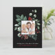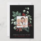 Elegant black holiday greeting card featuring your photo framed by a nature-inspired watercolor of a red cardinal and seasonal winter greenery. You can personalise your Christmas greeting, as well as your family names and the year in simple red and white typography.