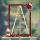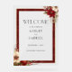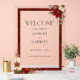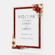 This romantic and classic Christmas or winter-themed acrylic welcome design features clusters of vibrant red and white winter flowers, pine, holly berries and rustic twigs, custom modern text graphics and editable text fields surrounded by a rich red damask border with gold edges.