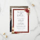 This romantic and classic Christmas or winter-themed save the date design features clusters of vibrant red and white winter flowers, pine, holly berries and rustic twigs, custom modern text graphics and editable text fields surrounded by a rich red damask border with gold edges. Back features a photo template.