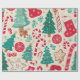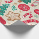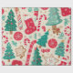 This Christmas wrapping paper pattern features classic holiday elements such as Christmas trees, candy canes, snowflakes, gingerbread cookies and ornaments. It is filled with reds, greens, golds, and whites, set against a warm light beige background, creating a cosy festive feel. This paper is perfect for wrapping gifts.