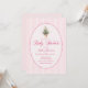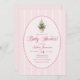 Soft pink baby shower invitation featuring a watercolor Christmas tree, pastel striped background, and a delicate dotted oval frame with elegant typography and festive winter charm.