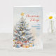 An elegant Christmas tree graces this lovely folded holiday card. Pretty gold baubles highlight the snowy pine and a bright star is the topper on this vintage watercolor design. Gifts and packages in pretty matching colours are all around the base of the tree. The greeting on the front of the card is "Christmas Tidings", but you can change that to another seasonal greeting of your choice, if you prefer. On the inside, also in red and blue typography, are example sentiments of good tidings and "from" names. Be sure to change these to your choices, as well as the family name and date on the front.