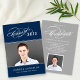 Announce your high school or college graduate in style with this elegant script graduation announcement and party invitation. Two-sided card features two photos of the graduate, custom white text, and calligraphic script accents. Navy blue and grey background colours can be modified to coordinate with your photo or school colours.