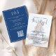 This design features a classic calligraphy elegant QR code RSVP photo wedding invitation blue template, with a simple blue floral flower template, an online guest response classic photo, a formal traditional calligraphy script, minimalist typography boho suite, classy modern minimal, with a scan scannable QR code website, digital download greenery foliage simple, photo vellum transparent effect, an elegant classic stationery suite