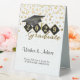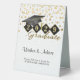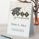 This elegant table tent sign features black and gold shield and cap personalised with your graduating year. Custom text "Wishes & Advice" and instructions for guests. Use the 'Personalise' button to customise the product.