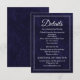 This elegant wedding details card features a rich navy blue textured background paired with refined white typography for a timeless, formal presentation. Designed to complement classic and black-tie wedding stationery suites, the layout clearly organizes accommodations, reception information, and additional details in a clean, easy-to-read format. A graceful script headline combined with traditional serif text creates a sophisticated balance, while the double-line border adds a polished finishing touch. Perfect for couples hosting formal, evening, or traditional weddings who want to share essential guest information in a coordinated and upscale style.