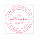 This simple, yet elegant and classy return address stamp features a double circular frame broken in half, with an address on the top and bottom and the family name in the middle, written in a fancy script calligraphy. You can customise the design and create your own unique return address stamp by clicking the 'personalise' button and replacing the details with your name and address. Design it with me!