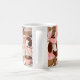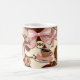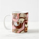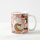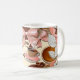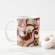 This coffee mug features a charming and elegant design centred around a coffee theme. The artwork includes a steaming cup of coffee on a saucer, surrounded by soft pink bows, coffee beans, and rich brown tones that evoke warmth and comfort. The background has a cream-coloured base that contrasts beautifully with the darker coffee hues. A customisable monogram with the initials “MW” is prominently displayed in the centre, adding a personal touch. The overall aesthetic is sophisticated yet cosy, making it perfect for coffee enthusiasts or as a thoughtful gift.