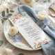 Add a romantic, garden-inspired touch to your reception tables with this elegant wildflower wedding menu card. Featuring delicate watercolor blooms in soft blush, blue, and golden hues at the top and bottom, this design beautifully frames your menu selections with timeless floral charm.