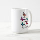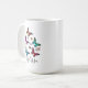 A personalised coffee mug designed with an elegant pattern with a graphic illustration of fluttering butterflies in many bright colours. Whimsical florals, sprigs and leaves add a bit of charm.