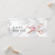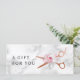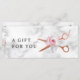 Modern and elegant gift certificate for hairstylists with faux copper rose gold scissors, pink and white roses, white marble background and elegant calligraphy font.