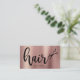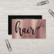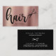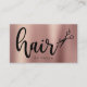 Modern business card for hairdressers or hairstylist with scissors, faux copper rose gold background and elegant calligraphy font.