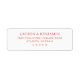 This return address label features a clean, minimalist design with centred text on a white background. The layout uses a muted coral red colour for all elements, creating a cohesive and sophisticated look. A bold serif font adds elegance to the customisable name and address sections, while ample spacing ensures clarity and readability. Perfect for those who appreciate modern simplicity, this label conveys professionalism and understated style.