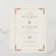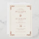 This elegant wedding invitation features a classic rectangular layout with a vertical orientation, centered text, and decorative floral motifs in the corners. The soft cream background is complemented by gold accents, creating a sophisticated and warm atmosphere. The design incorporates ornate flourishes and botanical elements that frame the central text, enhancing its theme of celebration and elegance. With a mix of serif fonts, it balances formality and readability, making it perfect for a refined wedding event.