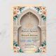 Set a sophisticated tone for your Nikkah ceremony or Walima reception with this elegant architectural design. The layout features soft peach roses and sage green leaves framing a printed faux gold Bismillah script against a cream background. Easy to customize with your specific venue details and dates.