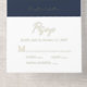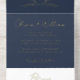 Elegant dark navy blue all-in-one wedding invitation featuring your monogram initials inside a vintage wedding crest, your names, "Reception to follow" and "Rsvp" showcased in a chic script, your invitation details in classic serif typography, and a white tear-away RSVP response postcard, all rendered in your choice of genuine gold, silver or rose gold foil. If desired, you can adjust the size of the script for longer or shorter names by editing in the design tool.