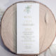 Perfect for displaying meal selections at your after celebration gathering, this baptism menu blends gold, cross, bow, elegant script, watercolor artistry, botanical details, and sage green tones for a polished and meaningful presentation that beautifully complements the matching invitations and napkins.