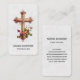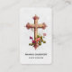 Business cards with a pretty illustration featuring a simple wooden cross covered in pink flowers and green leaves.