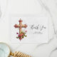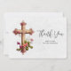 Thank you card with a pretty illustration featuring a simple wooden cross covered in pink flowers and green leaves.