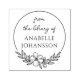 This elegant custom library book rubber stamp features a round simple wreath with flowery botanicals on the bottom. Inside is your custom name in elegant typography and ´from the library of´´ text in lovely handwriting. To make your own library book stamper, click on the ´´Personalise´´ button and replace the template name with your own.