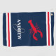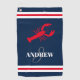 Elegant custom name red lobster golfing gift golf towel. Custom printed sports presents for him or her. Unique golfing gifts for men and women. Unique Birthday gift ideas for golfer, husband, dad, wife, mum, father, friend, co worker, boss, colleague, coach, instructor, trainer, teacher, grandpa, retired person, pensioner, golf lover, player, politician, tournament etc. Including hook to hang it up. Cool monogrammed golf accessories for friends and family. Also great for Christmas or Father's Day. Classy template design with red stripes. Add your own surname, quote or saying. Luxury gifts with chic lettering.