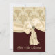 Elegant wedding rehearsal dinner invitation, done in dark brown, white, and cream tone colours. Graphics of a lovely tan on cream wheat pattern damask, on the top, and solid dark brown, on the bottom, of the invitation, with a lovely cream coloured ribbon and bow, across the middle. You Are Invited, in pale yellow script text, on the front of the invitation, and all text, on the backside, is fully customisable to suit your event needs. Lovely invitation the couple will treasure, with all their wedding mementos.