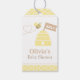 Elegant and stylish bee themed baby shower labels in the colour palette of pastel yellow, white and brown. Elements of design include a cute little bee that is flying by towards the bee hive and leaving a heart shape trail. Background of yellow and white hexagon honeycomb pattern. Personalise easily with your party message.