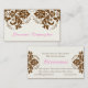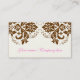Elegant damask motif brown, ivory business cards, featuring a stylish brown damask motif on ivory background. Text in pink. A feminine, trendy design of a classic theme with a contemporary look. Modern yet with a vintage/retro feel to it. This classy, fashionable design would work well for several business fields such as interior designers, hairdressers, hairstylists, fashion, beauty salons, stylists, textiles and more.