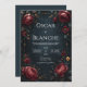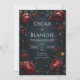 Immerse your guests in a world of moody romance with this stunningly dramatic design. The artwork features a deep, textured midnight background that sets a sophisticated stage for the rich, velvety elements. The corners are adorned with lush, oversized burgundy and crimson blooms, detailed with dark foliage and antique gold accents. A slender, geometric golden frame weaves through the flowers, adding a touch of structure and modern elegance to the vintage-inspired composition. This bold and beautiful design is an impeccable choice for a winter evening wedding, a Valentine's Day engagement party, or a formal masquerade ball. You might also select this passionate aesthetic for a milestone anniversary dinner, a sophisticated quinceañera, or a twilight bridal shower. This moody floral border is also perfectly suitable for memorial service programs, luxury salon service menus, or high-end boutique gift certificates.